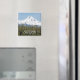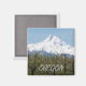 Square fridge magnet featuring a scenic photo image of the jewel of Oregon, Mount Hood, along with blossoming fruit orchards in the valleys below. Makes a great travel souvenir!