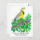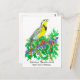 A postcard featuring the Western Meadowlark singing as he perches on an Oregon Grape bush inspired by the State Bird and State Flower of Oregon drawn with black pen and ink and painted with watercolor.