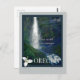 A digital painting of a waterfall found along the switchback trail of Multnomah Falls in Oregon's Columbia River Gorge Scenic Area. The white number in the top corner is the year that Oregon became a state. The white lettering in the centre of the painting, "She flies with her own wings", is the state motto. At the bottom of the painting is a white trillium flower next to Oregon in white lettering. A simple dark blue border finishes the painting. Image Copyright ©2023 Kimberly J Tilley.