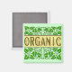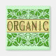 Organic a green slogan for gardeners, cooks and Earth Day celebrations, in decorated capital letters against a background of acorns and oak leaves, surrounded by scrolling leaves.