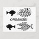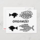 A visual illustration of the concept "there is strength in numbers". A large fish pursues many small fish until they organise into the shape of an even bigger fish, turning the tables, pursuing the fish that was originally chasing them.