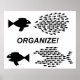 A visual illustration of the concept "there is strength in numbers". A large fish pursues many small fish until they organise into the shape of an even bigger fish, turning the tables, pursuing the fish that was originally chasing them.