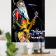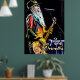 A vibrant, stylised portrait of Orianthi, a renowned guitarist, captured in a dynamic pose. She is holding a guitar, its body adorned with intricate patterns in shades of yellow and orange. Orianthi is wearing a leather jacket with a colourful, almost abstract design, and her long blonde hair flows down her back.