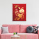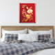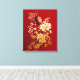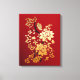 Stunning and elegant, this floral design features golden flowers and leaves with black branches on a radiant red background in an oriental style.