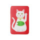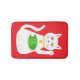 This awesome bath mat features a graphic design image of a lucky oriental white waving cat. The cat has beautiful gold eyes and is wearing a gold medallion on the collar around its neck. The cat has pink ears and whiskers. This cute little kitty is holding a golden token with green jade inlay and a message in golden text that says "Good Luck".