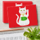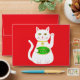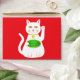 This awesome envelope features a graphic design image of a lucky oriental white waving cat. The cat has beautiful gold eyes and is wearing a gold medallion on the collar around its neck. The cat has pink ears and whiskers. This cute little kitty is holding a golden token with green jade inlay and a message in golden text that says "Good Luck".