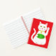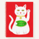 This awesome notebook features a graphic design image of a lucky oriental white waving cat. The cat has beautiful gold eyes and is wearing a gold medallion on the collar around its neck. The cat has pink ears and whiskers. This cute little kitty is holding a golden token with green jade inlay and a message in golden text that says "Good Luck".