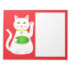 This awesome notepad features a graphic design image of a lucky oriental white waving cat. The cat has beautiful gold eyes and is wearing a gold medallion on the collar around its neck. The cat has pink ears and whiskers. This cute little kitty is holding a golden token with green jade inlay and a message in golden text that says "Good Luck".