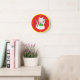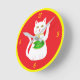 This awesome wall clock features a graphic design image of a lucky oriental white waving cat. The cat has beautiful gold eyes and is wearing a gold medallion on the collar around its neck. The cat has pink ears and whiskers. This cute little kitty is holding a golden token with green jade inlay and a message in golden text that says "Good Luck".