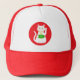 This awesome hat features a graphic design image of a lucky oriental white waving cat. The cat has beautiful gold eyes and is wearing a gold medallion on the collar around its neck. The cat has pink ears and whiskers. This cute little kitty is holding a golden token with green jade inlay and a message in golden text that says "Good Luck".
