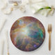 A bright and colourful outer space photo of the orion nebula. Turquoise yellow and orange ethereal plasma gases with luminous highlights create a colourful composition.