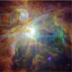 The Spitzer Space Telescope and Hubble show the Orion Nebula in an explosion of infrared, ultraviolet, and visible-light colours. At the heart of the nebula is a set of four monstrously massive stars, collectively called the Trapezium. These behemoths are approximately 100,000 times brighter than our Sun. Their community can be identified as the yellow smudge near the centre of the composite. Credit: NASA, ESA, T. Megeath (University of Toledo) and M. Robberto (STScI)