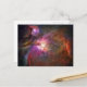 This is a photograph of the massive Orion Nebula, taken by the Hubble Space Telescope. The Orion Nebula is the birthplace of many new stars, and over 3000 stars are present in this image, surrounded by swirling clouds of gas and dust. The colours of the original photo have been enhanced slightly, and include rich oranges, pinks and purples.