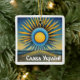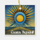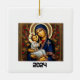 An ornament with an original artist print of sun in Ukrainian colours with the Ukrainian phrase "Slava Ukraini" Glory to Ukraine. One the reverse of an Eastern Orthodox icon of Mary, the God-bearer holding toddler Jesus with 2024 to mark year.