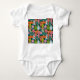 This baby bodysuit has a Christmas design of a jumble of various ornaments in many colors.