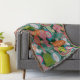 A quality printed throw has its advantages. This is a much finer weave throw than its loopier cousins, and though lighter, it is worth the investment for custom room accessorizing. The back is much prettier than the typical brown, and the fringe on the long sides very vivid, the selvage nicely done. Before photographing, I washed the throw in cold water, delicate, with a thicker woven throw the same size. On tumble dry low, this throw was dry in half the time as the other. This is a very practical quality if you use throws for furniture covers or to wrap up in frequently. The sleekness of the fabric makes it a great layer for accenting or protecting without the feeling of sitting on too much stuff. Perfect for napping or when you feel a light chill coming on. The color printing is beautiful and on this fabric, matched the design and color of my Photoshop image. This is an advantage for blending room fabrics and colors. The fringe on the short sides prints the colors from the design image and therefore varies from the side fringe. I streaked a white fractal line through the plaid pattern to give the illusion of weaving. This printed as crisp as an illusory thread, and put some white in the short side fringe, showing another advantage of print vs loomed- for artistic purposes, line lines, detail, and color integrity can be planned and preserved. My loomed throws have color limitations and more of a needlepoint texture. Print throws reproduce an exact image. The throw felt a little stiff straight out of the package, but this went away in the first delicate wash. Of course I searched the wash water for ink or bleeding and there was none.