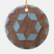 Quilt block in brown and blue "castle" pattern. The central "castle" is a brown star shape, surrounded by the "6 sided wall" with the "watch towers" extending out from the middle of the walls.