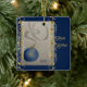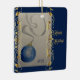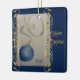 Painted blue ornament has a swirling silver ribbon surrounded by a gold scrolling design. The perfect holiday season greeting; non-religious sentiment for Season's greetings. Personalise your signature.