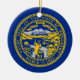 Crafted with attention to detail, this ornament honours Nebraska's rich heritage and values. The design proudly showcases the state's flag, featuring a blue field with the state seal in gold and silver. The seal includes a steamboat sailing on the Missouri River, a blacksmith with his hammer and anvil, a settler's cabin, and the state motto "Equality Before the Law," symbolising Nebraska's history of progress and prosperity.