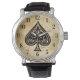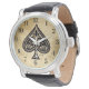 Ornate ace of spades design on aged-paper style background. Classic black numbering. Three hands.