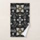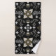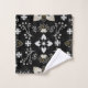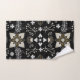 Ornate black and white floral pattern with gold accents. Central symmetrical flower surrounded by leaf motifs and intricate branches. Elegant, decorative design.