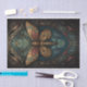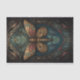 A haunting image of a beautiful butterfly with ornate scrollwork all around and a gorgeous landscape backdrop.