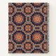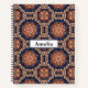 Spiral notebook with a repeating pattern of decorative ornate elements in flower, star and sun shapes.