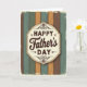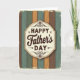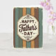 This design shows a cream-toned decorative plaque centred like a vintage sign, lifted slightly by a soft shadow that adds depth. Its curving, shield-like shape frames the words “HAPPY Father’s DAY,” with “HAPPY” and “DAY” in sturdy serif capitals and “Father’s” in a flowing cursive style. The lettering appears in warm brown, and a thinner, darker brown outline traces the plaque’s edge to make it stand out. Small scroll accents and tiny star-like marks sit near the top and bottom, giving the sign a gentle, affectionate touch that feels like a quiet nod between loved ones 👨. Behind it, vertical wooden planks form the setting in muted teal, golden ochre, and deep brown, with visible grain lines and worn streaks that suggest years of shared projects 🛠️. A roughened, distressed border surrounds the whole design like softened, timeworn paint along the edges. The plaque stays centred against the striped boards, with the brown text clearly readable on the light background and the decorative flourishes balanced above and below.