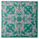 Transform your interior spaces with this exquisite ceramic tile design showcasing an intricate floral filigree motif set against a vibrant emerald green background. The ornate composition features flowing botanical scrolls, stylized leaves, and symmetrical flourishes rendered in soft pink, sky blue, and warm terracotta accents. Inspired by classic ornamental art, this design blends vintage elegance with a fresh, contemporary palette, making it ideal for statement backsplashes, bathroom walls, fireplace surrounds, tabletops, or decorative installations. Its detailed linework and harmonious color layering bring depth, sophistication, and timeless visual appeal to any room.