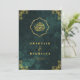The back of the invitation maintains the sophisticated emerald green backdrop, beautifully framed by a rustic gold border. This creates a sense of tradition and royalty, reflecting the importance of your special day. Within the frame, all the essential details are clearly presented: the bride and groom's names, the date and time of the ceremony, the venue location including city and state, and the exciting news of a reception to follow.