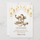 Luxury white and gold Eid greeting card featuring a decorative arch, intricate geometric patterns, and hanging golden lanterns. A timeless and sophisticated choice.