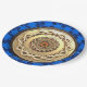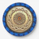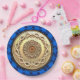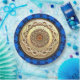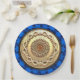 An ornate metal Passover matzah tray with a 3D fractal Magen David (Star of David). The plate ais superimposed on a blue-toned background image with multiple Magens David. Hebrew text on the plate reads, "מצה" (matzah) and "פסח שמח" (pesach sameach - Happy Passover).