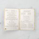 Design interior displays the traditional format for a Catholic wedding program. Includes room for up to five bridesmaids and groomsmen, plus Maid/Matron of Honour. Clear, easy-to-read customisable text is displayed in an elegant coffee-coloured font against a delicate background colour known as "Bridal Heath."