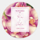 Playful orchids in bloom provide an ornate, even romantic appeal for these wedding classic round stickers. Features warm romantic colours: a blend of purple, plum, champagne, ivory, and green hues. Use the template to personalise.