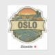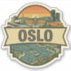 The artwork features a retro-style emblem showcasing the Oslo skyline, centering on the majestic Royal Palace (Slottet) and the historic Akershus Fortress, alongside the striking modern architecture of the Oslo Opera House. Below the bold "OSLO" banner, a serene view of the Oslofjord depicts islands, cabins, and ferries navigating the blue waters. Rendered in a nostalgic palette of muted teal, rust, and cream, this design is the perfect souvenir for Scandinavian adventurers.