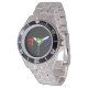 Has heft and feel of expensive stainless steel quartz watches. Good band with safety catch. I removed links, which is easy because engraved arrows show direction to push the linking pins. As always by this seller, the image (a railroad logo) is a perfect reproduction of my emailed image, and is precisely spaced and aligned.