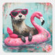 Otter Floating on a Pink Flamingo Funny Collage Square Sticker