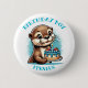 Blue Otter themed boy's first birthday boy button. Cute cartoon otter holding a birthday cake.