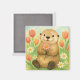 A magnet with a watercolor illustration of a playful sea otter holding a pink daisy flower, with spring tulips and white daisies around him