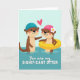 This card shows two cartoon otters floating in calm, two-tone aqua water under a pale aqua sky, sharing a sweet, friendly moment 🥰. The left otter wears a blue swim cap and leans in with a gentle paw extended, eyes turned toward its companion as if mid-hello. Across from it, the right otter wears a pink swim cap with a small white-and-yellow flower and relaxes in a bright yellow inner tube, smiling back with rosy cheeks ❤️. A pink heart hovers between them, just above their heads, tying their warm eye contact together. The illustration uses crisp outlines and soft shading so the characters pop against the simple water-and-sky background. Below the scene, the phrase “You are my SIGNIFICANT OTTER” sits centered near the bottom in pink lettering, easy to spot against the lighter background. The water shifts from lighter aqua near the top to a deeper blue below, framing the otters in the middle.