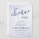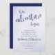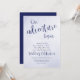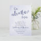 This simply designed typographic style wedding invitation features the phrase "Our adventure begins" in a whimsical dark blue calligraphy style script with coordinating script elements on a mottled blue and white background - your custom text and reverse side of invitation are matching dark blue - by katz_d_zynes