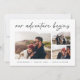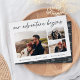 A modern and exciting engagement announcement card for the adventure-minded couple, this clean and simple design features three horizontal or landscape orientated photos in a grid collage layout, with "our adventure begins" above in hand lettered script. Personalise with your announcement, names, and additional details along the bottom.