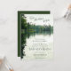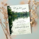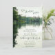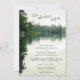 For your lakeside or riverside wedding celebration, this rustic "Our adventure begins" wedding invitation card, created from my own personal kayaking photograph and with a subtle digital watercolor effect and typographic elements, features a beautiful nature scene under an overcast sky with lightly rippled but calm water reflecting distant evergreens, cedar trees and rock structures - by katz_d_zynes
