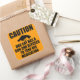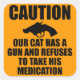 A silhouette of a handgun and the phrase "Caution, our cat has a gun and refuses to take his medication"