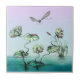 This is reproduced from a hand colored/ painted antique tile that looks like a watercolor painting of a marsh scene with a dragonfly over a pond of waterlilies with a clump of grass and a beautifully colored sky. Nice enough to frame and hang on a wall, use as a wall tile, trivet, coaster, or place it on a small easel as an object d'art.