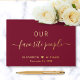 Elegant burgundy red wedding guest book featuring your choice of real gold, silver or rose gold foil, "Our Favourite People" in simple typography and a chic script with swashes, your names romantically joined together by a heart and your wedding date. Customise your title on the spine and add a photo on the back.