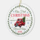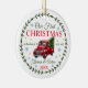 Celebrate your first Christmas as husband and wife with this charming personalised ornament! Our custom-designed keepsake features a nostalgic red pickup truck carrying a festive pine tree all ready to take home to decorate. Snowflakes and stars are scattered around the design. Customise with your names and the year to make it truly yours. On the reverse side is a perfect spot for your cherished photo, creating a lasting memory of this special holiday season. Share the joy of your love story with this unique holiday ornament! Edit text from the product page. To change font styles or colours, simply use the design tool!