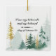 Inspirational Scripture Our First Christmas as Mr & Mrs ornament depicts a sparkling woodland watercolor design with gold and green pine trees. Personalise with last name. The back features Bible Verse Song of Solomon 6:3, "I am my beloved’s and my beloved is mine…"