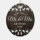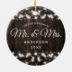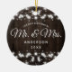 Our First Christmas As Mr. & Mrs. String Lights Ceramic Ornament. This design features a rustic wood background with rustic string lights.