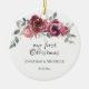 Beautiful floral wedding Our First Christmas ceramic ornament depicts elegant romantic hand-painted watercolor flowers in blush pink, burgundy and soft grey greenery shades. Front features names and date. The back has Bible Verse 1 Corinthians 13:13, "And now abide faith, hope and love, but the greatest of these is love."_